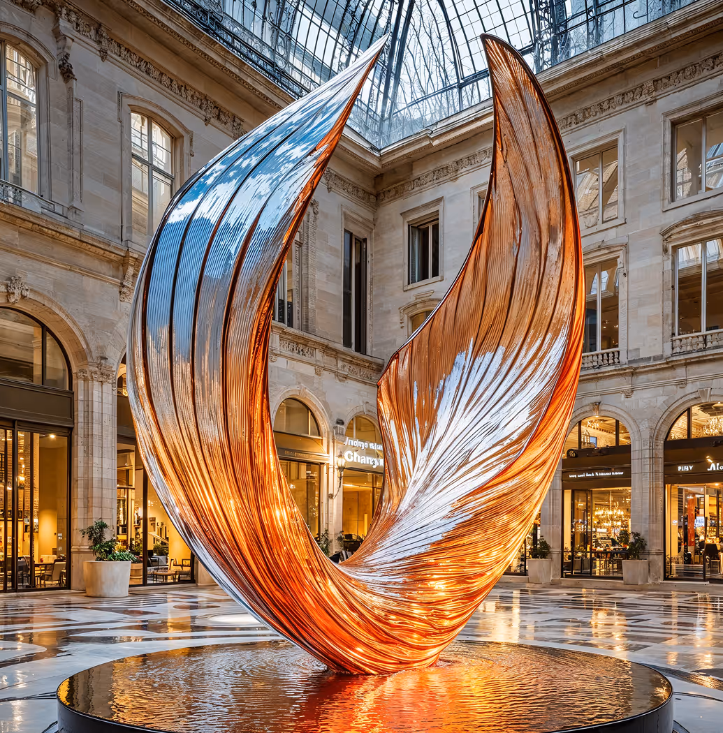 Flame Of Ascent incarna l'energia e la passione del fuoco, che si innalza attraverso un gioco di luce e forma. Le sue linee fluide e superfici riflettenti esprimono trasformazione e crescita. Questa scultura porta ispirazione e vitalità a grandi atri, gallerie d'arte e piazze urbane.