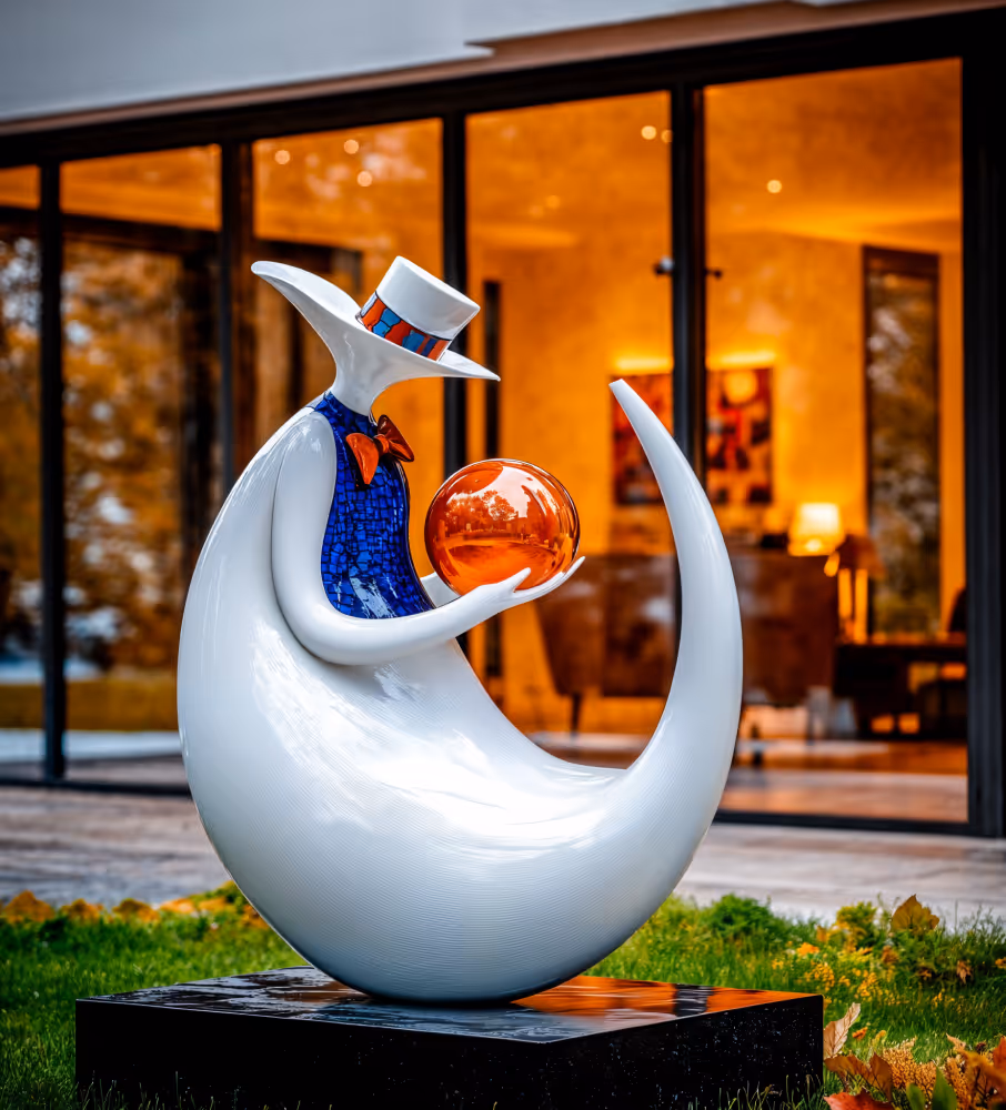 Mr. Elegance - una scultura raffinata che fonde lo stile classico con forme moderne. Una base elegante a forma di onda bianca sostiene la figura di un gentiluomo con un cappello stiloso, adornato con un sofisticato gilet blu e un papillon arancione. Il personaggio tiene una sfera vibrante che irradia una luce calda, simbolo di idee o sogni. Quest'opera aggiunge un tocco di sofisticazione e mistero a qualsiasi ambiente.