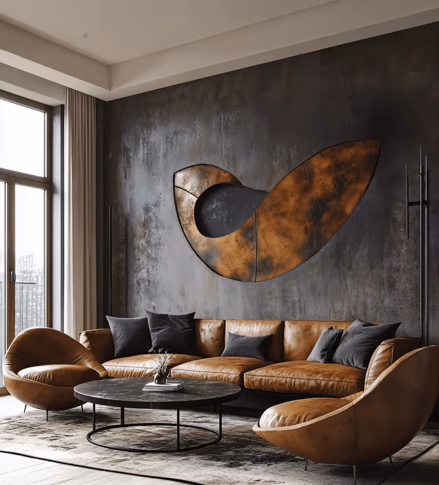 La composizione "Shadow" è realizzata in metallo patinato, evidenziando la sua texture naturale. Montata su una parete scura, quest'opera arricchisce l'interno con fascino moderno, lusso e calore. Le sue curve eleganti e il design astratto simboleggiano l'equilibrio e l'armonia all'interno dello spazio.